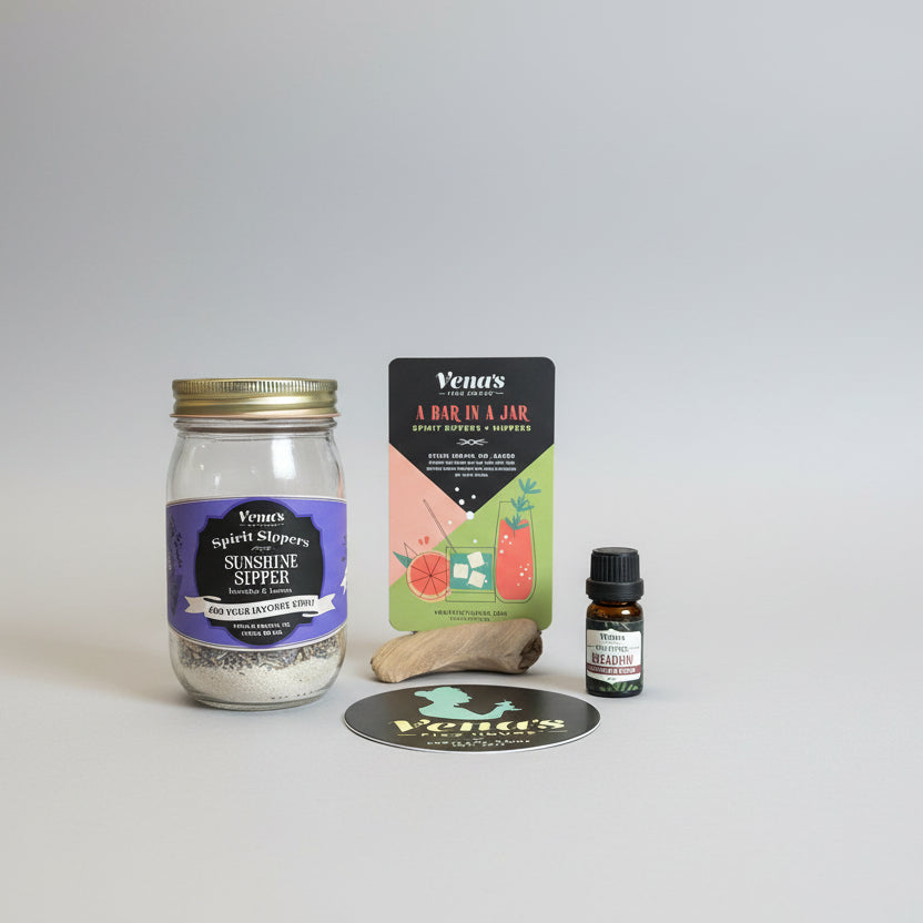 Vena's Sunshine Sipper cocktail pack pairs our Sunshine Sipper infusion with Vena's Meadow bitters. Sunshine Sipper infuses your spirit with lavender and lemon (makes a great lavender lemonade!). Together, the infused spirit and bitters create cocktails and mocktails with amazing flavors, depth and complexity. Each cocktail pack comes with a 16oz. infusion jar ready to pour in your favorite spirit (or hot water for mocktail). The infusion is also paired with a Vena’s Itty Bitter (10ml. size bitter), a “Bar in a Jar” card that gives instructions on how to build your cocktail and a Vena’s coaster. These sets come in 16 different flavors and make excellent gifts!