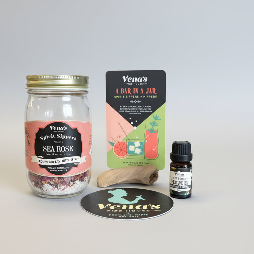 Vena's Sea Rose cocktail pack pairs our Sea Rose Sipper infusion with Vena's Flowers bitters. Sea Rose infuses your spirit with organic rose buds and sweet apple slices. This set can be used to make an amazing gin and tonic! Together, the infused spirit and bitters create cocktails and mocktails with amazing flavors, depth and complexity. Each cocktail pack comes with a 16oz. infusion jar ready to pour in your favorite spirit (or hot water for mocktail). The infusion is also paired with a Vena’s Itty Bitter (10ml. size bitter), a “Bar in a Jar” card that gives instructions on how to build your cocktail and a Vena’s coaster. These sets come in 16 different flavors and make excellent gifts!