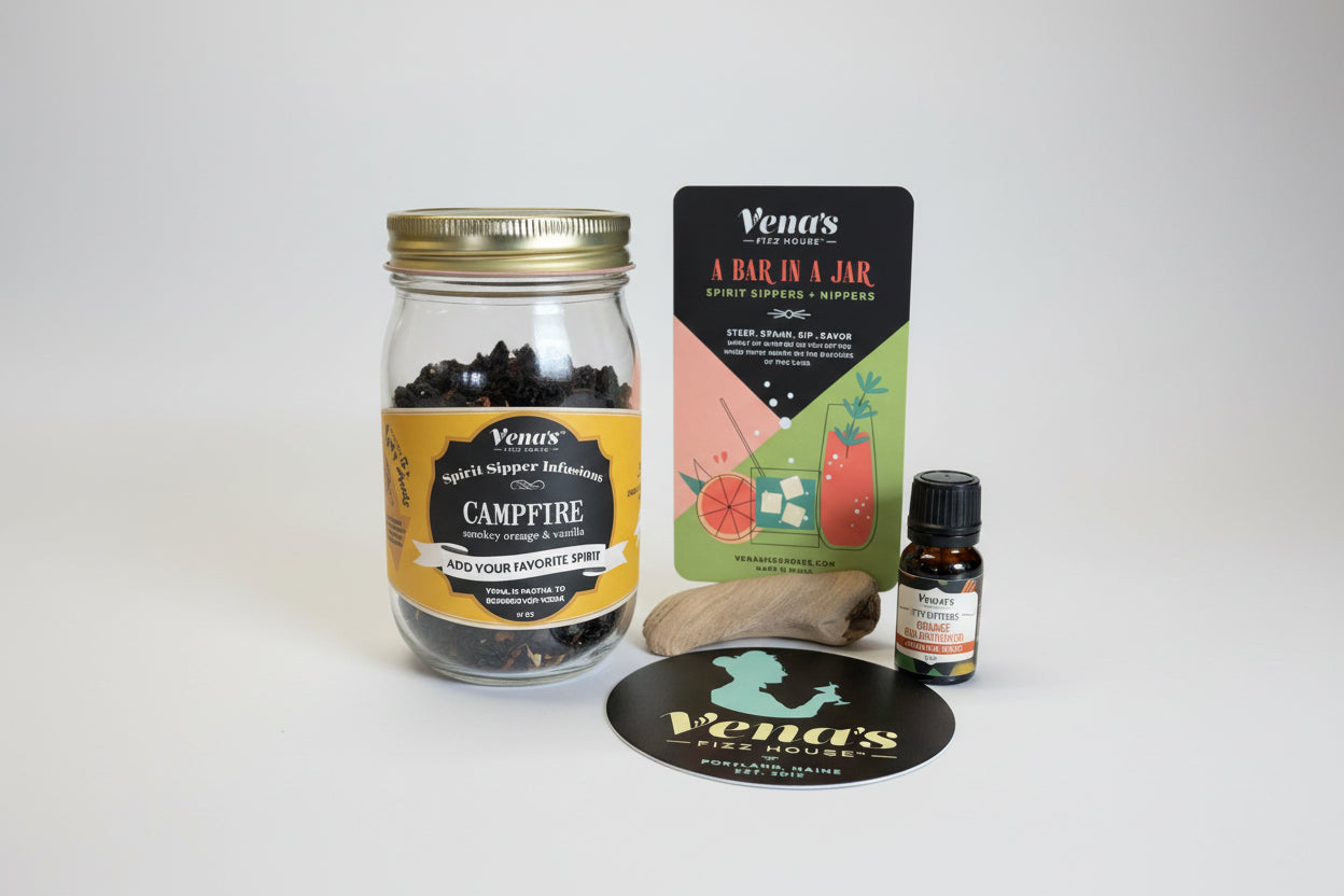 Vena's Campfire cocktail pack pairs our Campfire Sipper infusion with our Orange Old Fashioned bitters. Campfire Sipper infuses your spirit with just the right amount of smoke (makes an amazing smoky old fashioned!) Together, the infused spirit and bitters create cocktails and mocktails with amazing flavors, depth and complexity. Each cocktail pack comes with a 16oz. infusion jar ready to pour in your favorite spirit (or hot water for mocktail). The infusion is also paired with a Vena’s Itty Bitter (10ml. size bitter), a “Bar in a Jar” card that gives instructions on how to build your cocktail and a Vena’s coaster. These sets come in 16 different flavors and make excellent gifts!